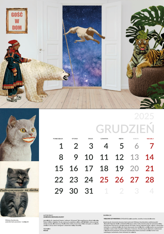 Grudniowa, ostatnia kartka z kalendarza przygotowanego rękami pracowników Pałacu Kultury Zagłębia, których prace miały nawiązywać to tematu przewodniego, którym była „zabawa”, a inspiracją dla nich miały być znane utwory kultury. Ten miesiąc obrazuje praca Agnieszki Bednarz-Oleksy, nawiązująca do kolaży Wisławy Szymborskiej.
