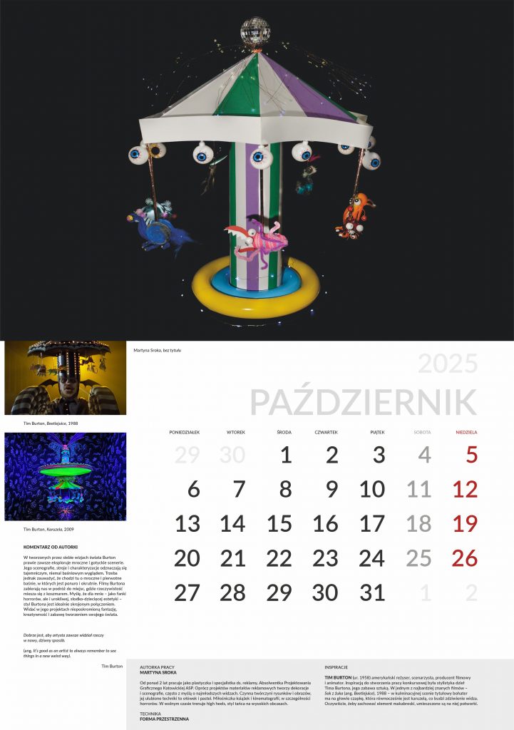 Oto październikowa kartka kalendarza przygotowanego rękami pracowników Pałacu Kultury Zagłębia, których prace miały nawiązywać to tematu przewodniego, którym była „zabawa”, a inspiracją dla nich miały być znane utwory kultury. Ten miesiąc obrazuje praca Martyny Sroki, nawiązująca do „twórczości „Karuzeli” Tima Burtona.